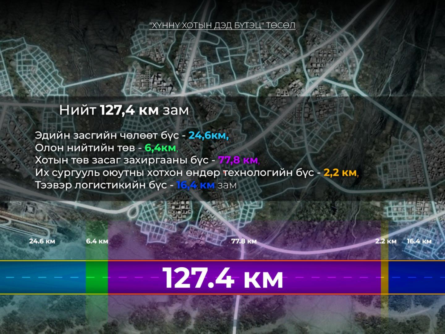 Төслийн хүрээнд нийт 127.4 км урт авто зам барина. Тодруулбал, эдийн засгийн чөлөөт бүсэд 24.6 км, олон нийт, худалдаа үйлчилгээний бүсэд 6.4 км, хотын төв болон засаг захиргааны бүсэд 77.8 км, их, дээд сургууль, оюутны хотхон болон өндөр технологийн бүсэд 2.2 км, тээвэр, логистикийн бүсэд 16.4 км авто зам барихаар тусгасан.