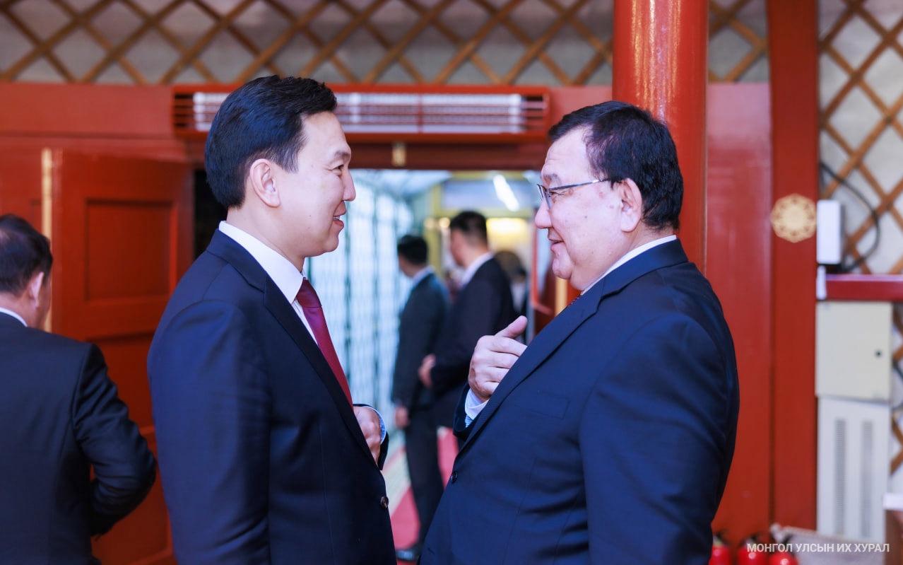 Төрийн ёслол хүндэтгэлийн өргөө цогцолборт болсон хүндэтгэлийн уулзалтын эхэнд Улсын Их Хурлын дарга Н.Учрал, эрхэм зочдод Монгол Улсын Үндсэн хуулийн түүхт 34 жилийн ойн өдрийн мэндийг дэвшүүлэв.