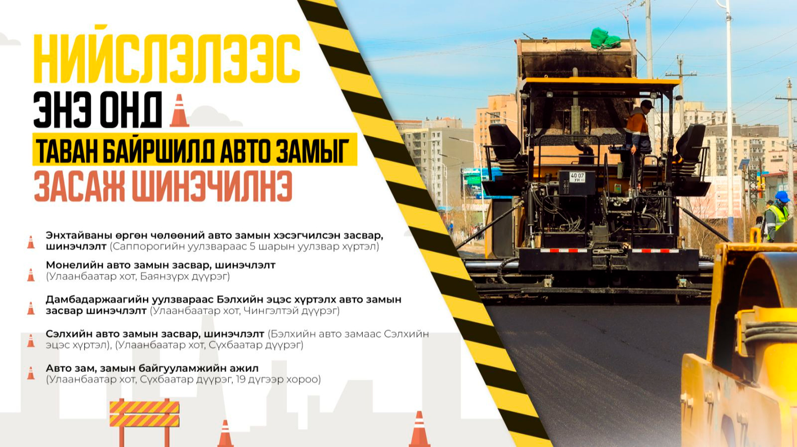 - Энхтайваны өргөн чөлөөний авто замын хэсэгчилсэн засвар, шинэчлэлт (Саппорогийн уулзвараас 5 шарын уулзвар хүртэл) – Тус ажлын хүрээнд 3.5 км авто замыг засаж, шинэчлэх бөгөөд гэрээ байгуулах шатанд явж байна.