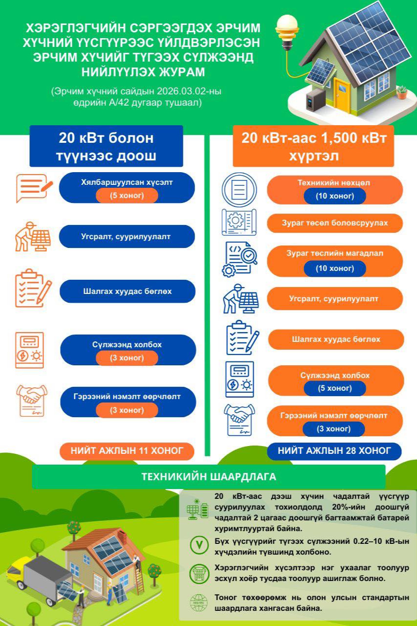 Эрчим хүчний сайдын 2026 оны 03 дугаар сарын 02-ны өдрийн А/42 дугаар тушаалаар шинэчлэн батлагдсан “Хэрэглэгчийн сэргээгдэх эрчим хүчний үүсгүүрээс үйлдвэрлэсэн эрчим хүчийг түгээх сүлжээнд нийлүүлэх журам” хэрэгжиж эхэллээ.
