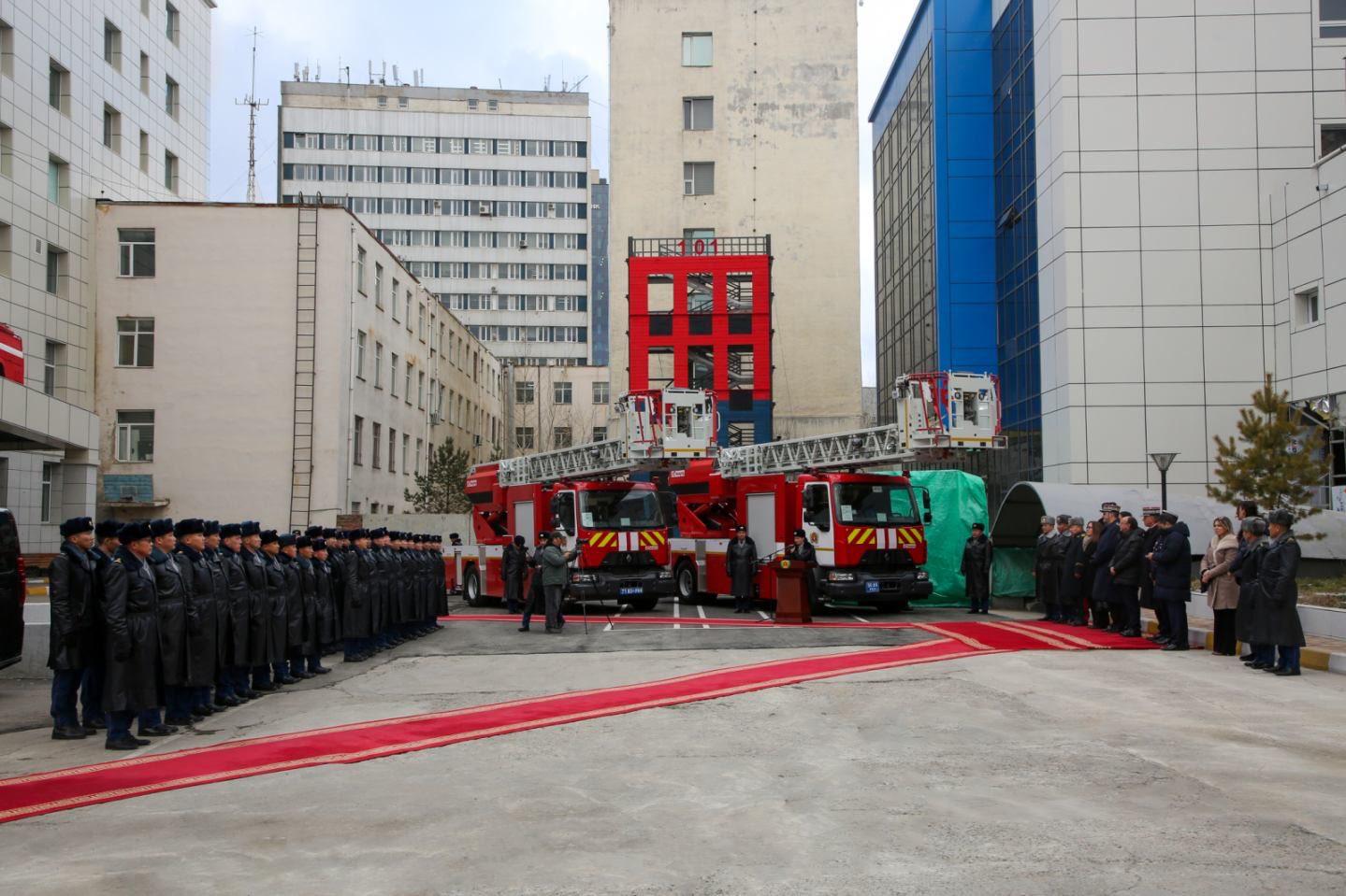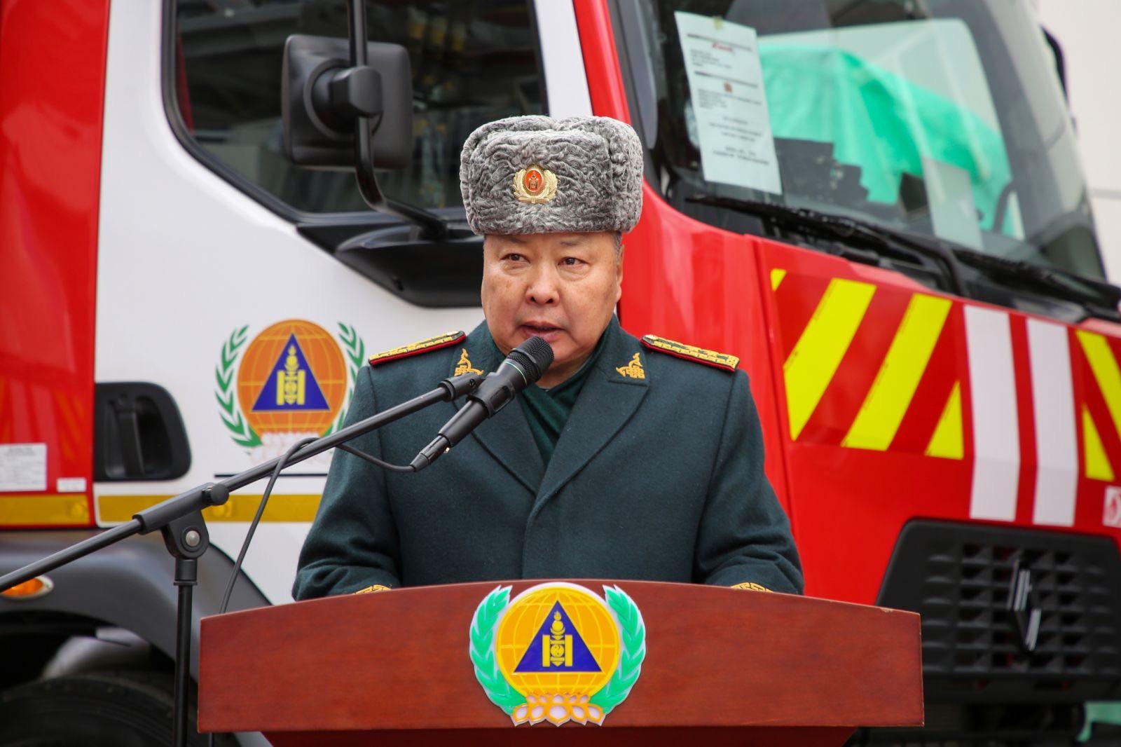 Хошууч генерал Г.Ариунбуян хэлсэн үгэндээ “Онцгой байдлын байгууллагын гал түймэртэй тэмцэх чадавхыг сайжруулах төслийн I үе шатыг 2019-2022 онд хэрэгжүүлж, Онцгой байдлын байгууллагад гал түймэр унтраах тусгай зориулалтын 4 төрлийн 42 ширхэг автомашин нийлүүлэгдсэн. Тус автомашинуудыг төв, орон нутгийн анги, байгууллагад хуваарилан, үүрэг гүйцэтгэснээс хойш 6500 орчим гал түймрийн дуудлагаар ажиллаж, 5100 орчим иргэний амь нас, 300 гаруй тэрбум төгрөгийн эд хөрөнгийг авран хамгаалсан. Харин II шатны төслийн хүрээнд гал түймэр унтраах тусгай зориулалтын 42м урттай автомеханик шатны автомашин 5, 32м урттай автомеханик шатны автомашин 10, хөөсөөр гал түймэр унтраах автомашин 3 буюу нийт 18 автомашин нийлүүлэгдэх бөгөөд ингэснээр гал унтраах тусгай зориулалтын автомашины хангалт 62.8 хувьд хүрэх юм. Өнөөдөр ийнхүү төслийн хүрээнд нийлүүлэгдсэн гал түймэр унтраах 42м урттай автомеханик шатны 2 автомашиныг хүлээн аваад байна” гэлээ.
