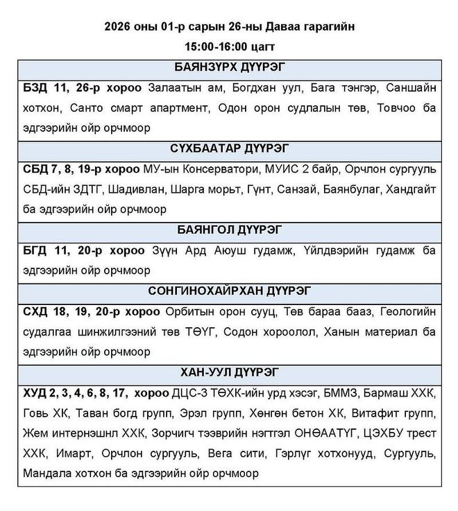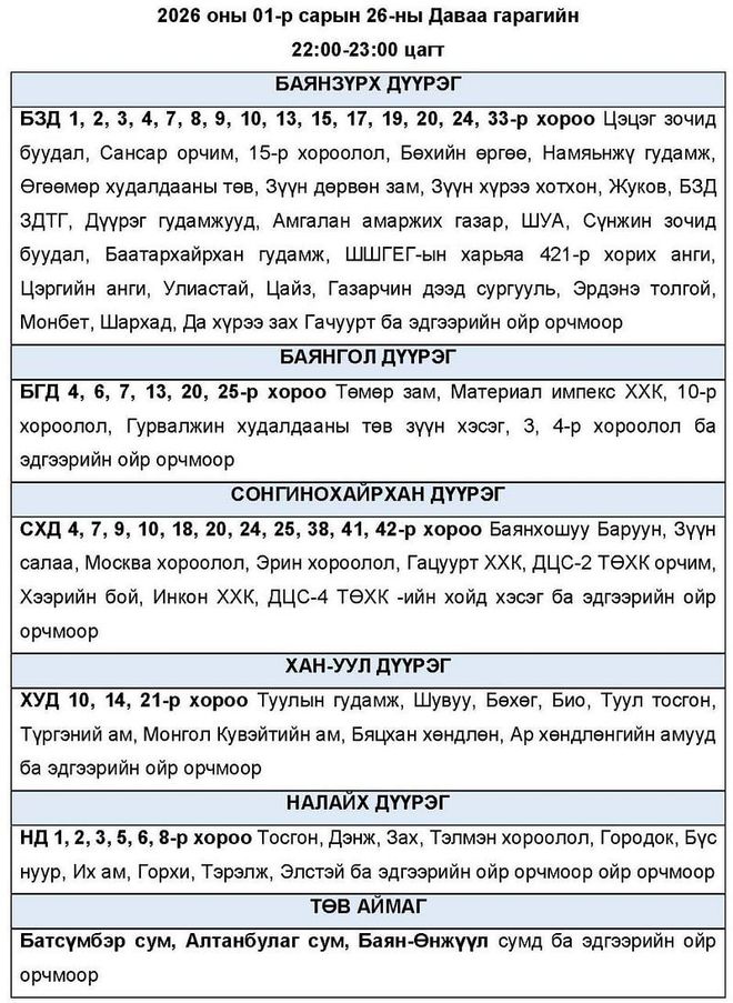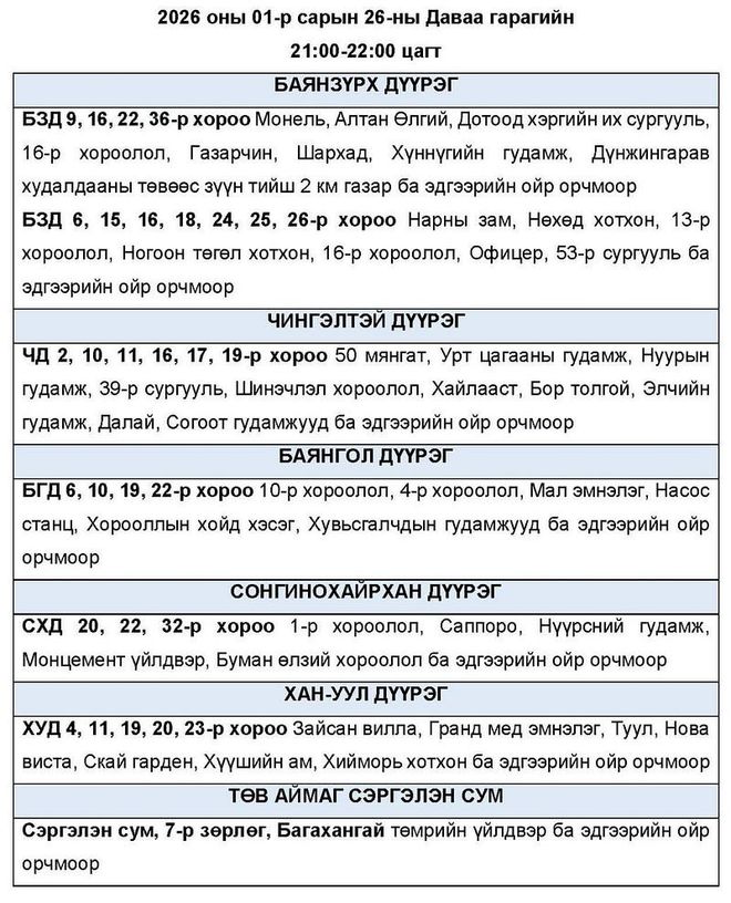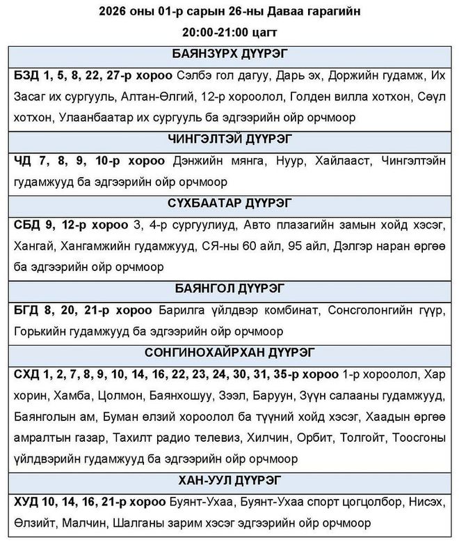Эрчим хүчний системд аваарын горим үүсэхээс сэргийлэн нийслэлийн хэмжээнд тодорхой байршлуудад цахилгаан эрчим хүчний төлөвлөсөн хэрэглээг “Диспетчерийн үндэсний төв” ТӨХХК-ийн шийдвэрээр хуваарийн дагуу 1-1.30 цагийн хугацаатайгаар хязгаарлах арга хэмжээ авч буй.